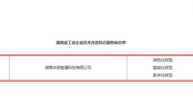 近日,湖南省工業(yè)和信息化廳正式公布湖南省工業(yè)企業(yè)技術(shù)改造綜合服務商入選名單,湖南華辰智通科技有限公司成功入選“綠色化轉(zhuǎn)型”、“智能化轉(zhuǎn)型”、“數(shù)字化轉(zhuǎn)型”三大類別服務商。